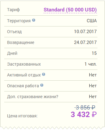 Для примера, вот стоимость страхового полиса в США для двоих человек на 14 дней (2 недели) без учета скидки и со скидкой 11%  по нашему промокоду SHEBOLDASIK: